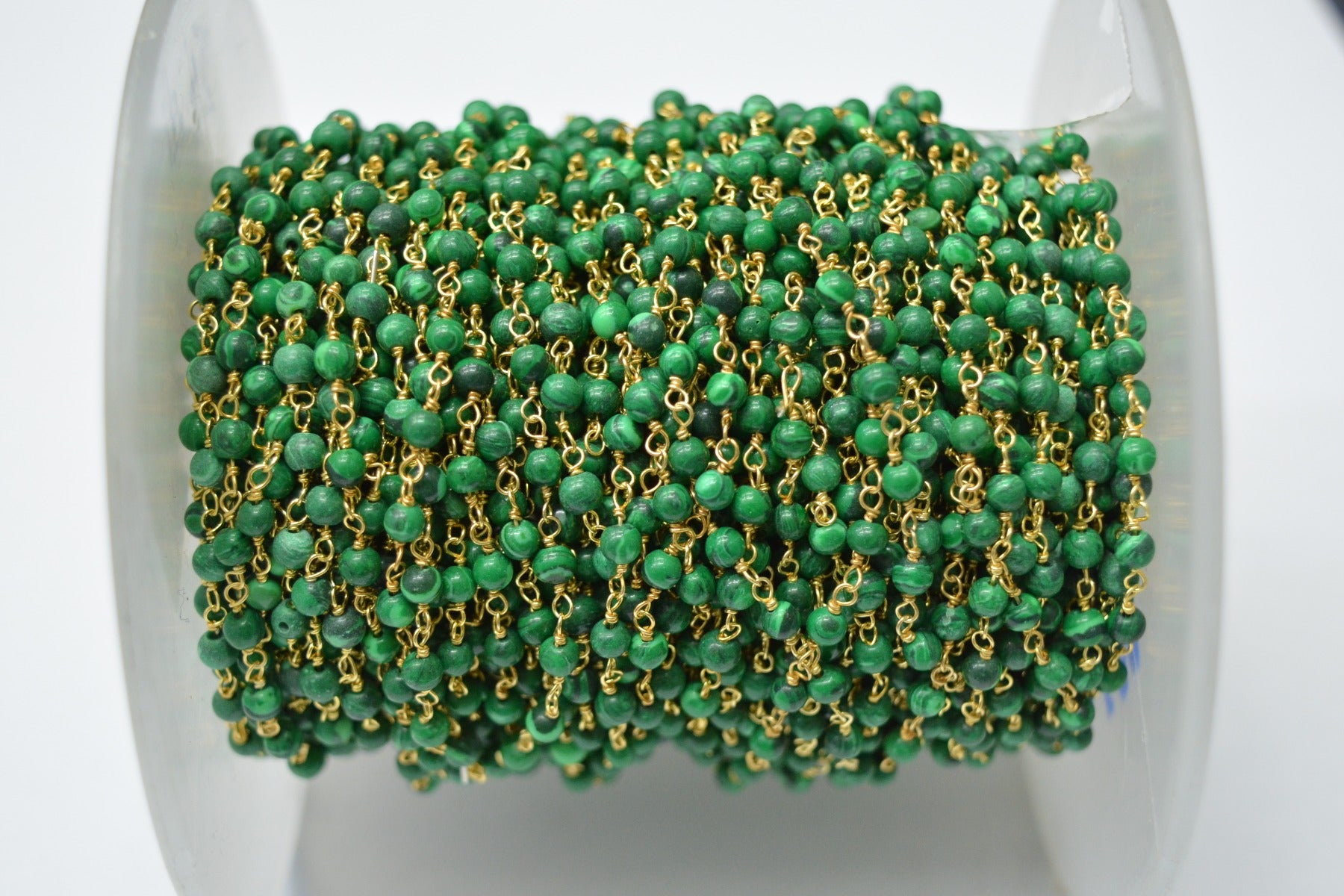925 Sterling Silver Gold Plated Beautiful Wire Wrapped Rosary Chain With Roundel Shape 3.00mm Malachite Stone. Sold By foot, ROS2-5599