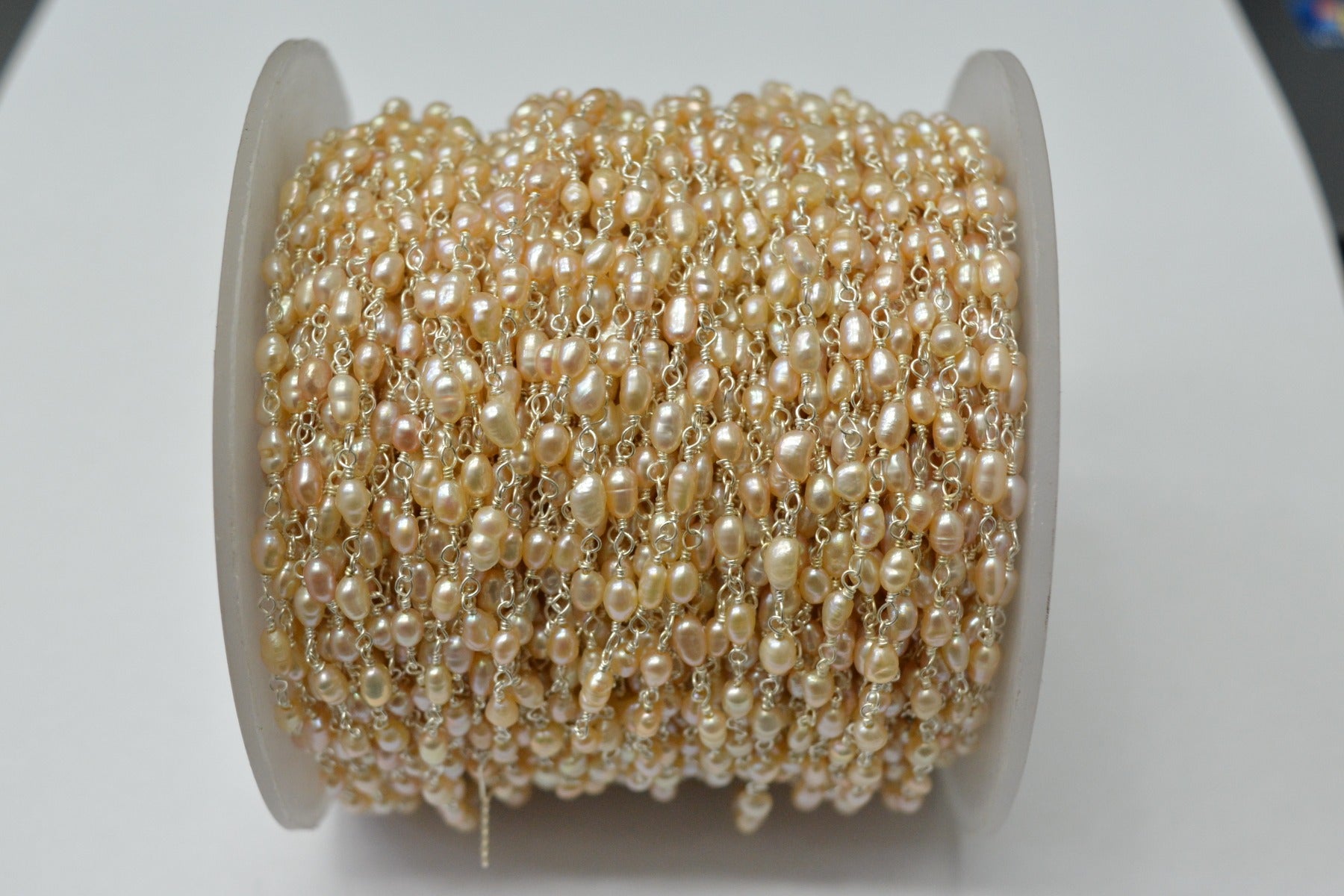 925 Sterling Silver Gold Plated Oval Shape 2.80x4.20mm Wire Wrapped Rosary Chain With Pearl Pink Stone. Sold By foot, ROS2-5688